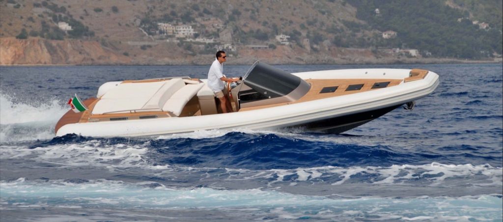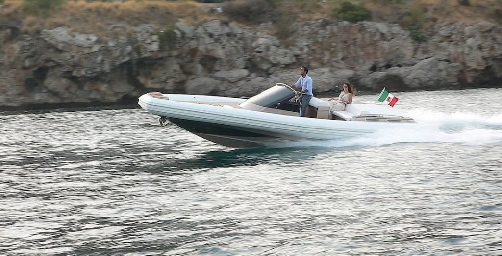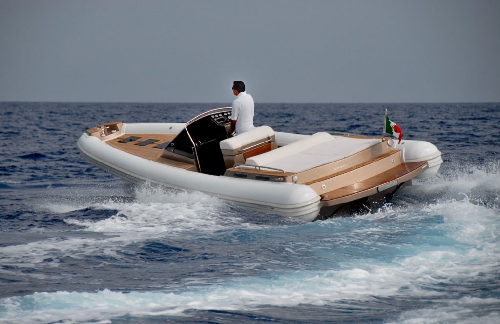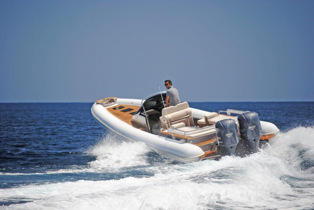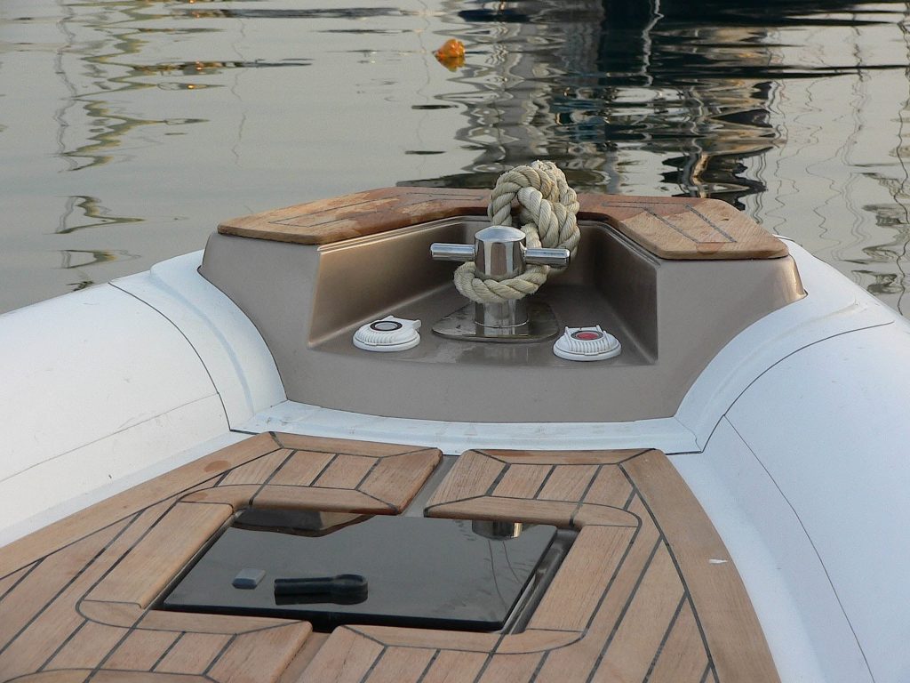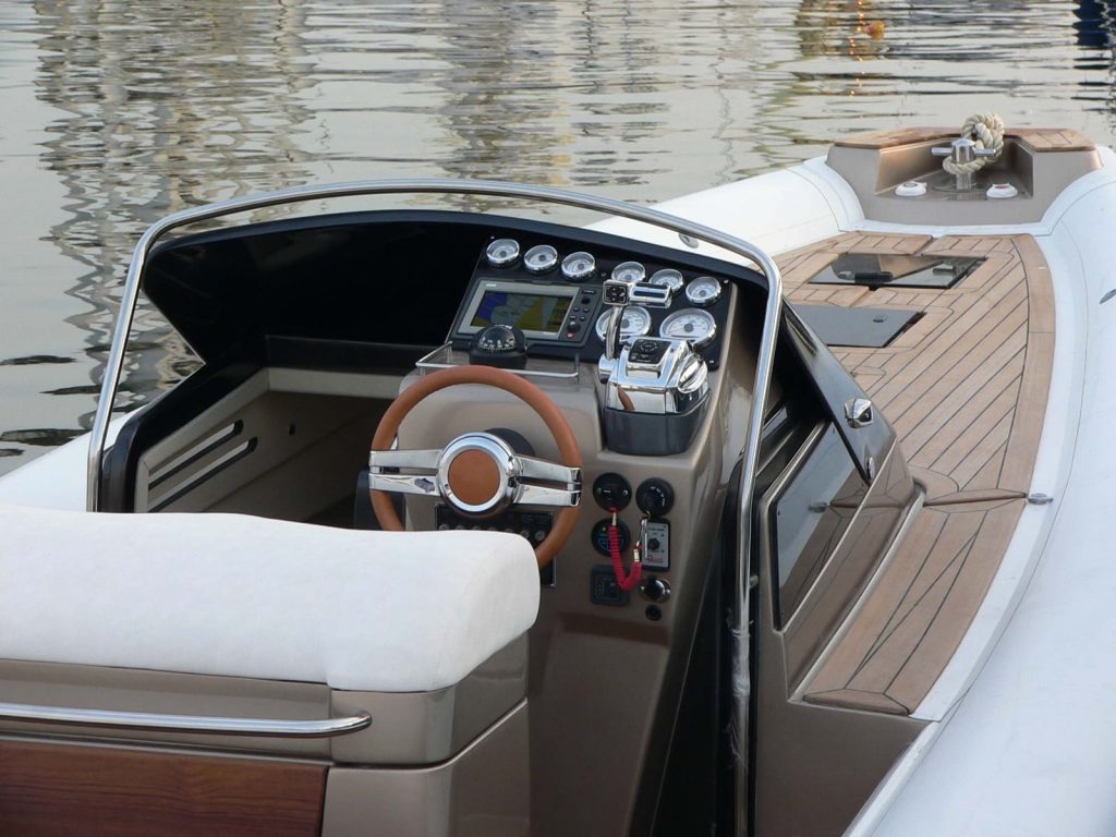 La disposizione generale del mezzo conserva l’impostazione tipica degli altri Maxi Rib della gamma Magazzù: ampi spazi prendisole a prua e a poppa, un comodo divano passeggeri, un tavolo a ribalta e un mobile frigo sotto la panca di guida.